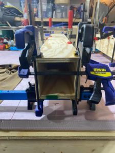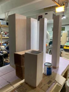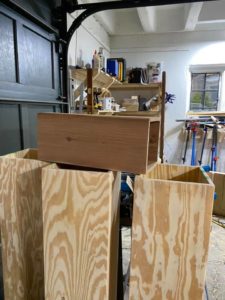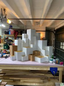 I sent a picture of it to Pastor Manisha and she immediately called to say that she has long imagined that the saints of God were like a palace of glowing light. That was an exciting moment, to know that we shared a similar vision. She gave the design the green light, so it was time to start making sawdust. Kellie Herdade drove me to Home Depot in her pickup truck to buy construction-grade plywood, which is not a particularly elegant material. I sliced up four sheets, mitered the edges so that the plywood end grain wouldn’t show when the sides were put together, and glued up a whole bunch of rectangular tubes, a couple at a time, clamping them while they dried.