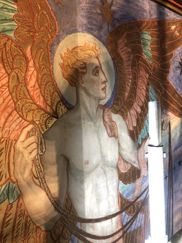 Work began on the frescoes on Tuesday of this week. It makes sense if you think about it, that the cleaning should begin at the top of the piece. So I encountered the team of restorers who were working around the mandala and the Lamb of God that we can only barely see from our vantage point at the church floor.